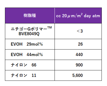 ニチゴーGポリマー™は、一般的に酸素バリア材として使用されているエチレンビニルアルコール(EVOH)よりも、ドライ条件下で 30-600倍 酸素バリア性に優れています。